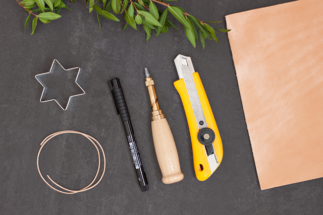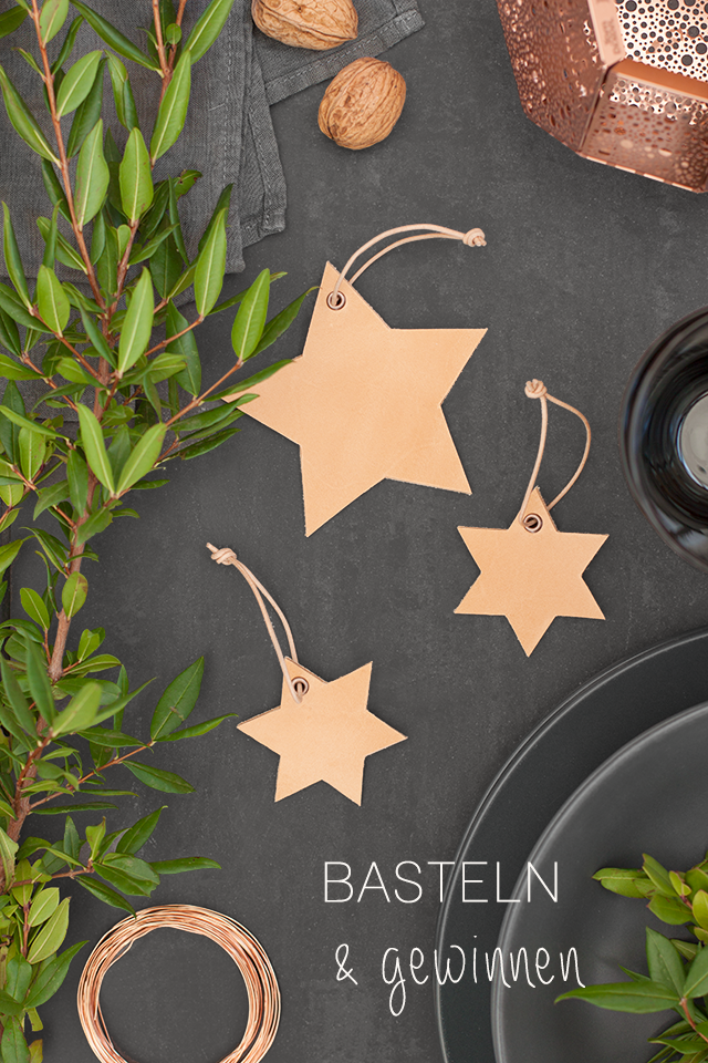 Ist der Stern ausgeschnitten, stanzt du ein Loch für die Aufhängung. Wer es gerne etwas schicker hat, der verpasst dem Loch anschließend noch eine Metallöse. Zum Schluss das Lederband durchfädeln und verknoten.